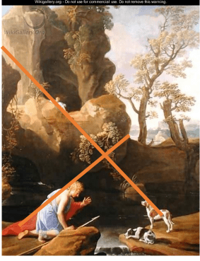 The sensualised rocks around Echo clearly mimic the echo chamber of the ear but may also symbolise the vagina and reproduction. The rock is surrounded by young vegetation, even above the head of Narcissus, who does not look at it. It is the source of the running water, in the temporary stillness of which a pool is formed in which Narcissus finds his beloved image, regardless that the water continues to flow through it and the cleft at the bottom picture frame. The female brown spotted dog knows that and looks to the sound caused by the echoing cave rather than sadly to the bewitched Narcissus. Irrespective of either the final, top-right segment is open and full of light, backgrounding more life, even that that comes from a stunted tree, although more fully by the arch of the growing tree. The scene is dissected by diagonal lines that emphasise moral elements. The central darkness, the right leaning growth. The left (sinister) sources of darkness and obstruction.