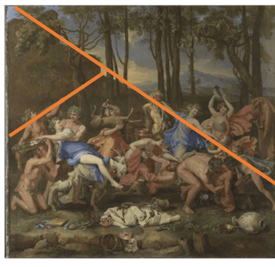 How might that help with Poussin. Poussin too draws a moral line with landscape and human bodies in his final painting. We can look at that first. The obvious dissecting lines which Poussin draws attention too are seen here. A romantic-cleft leans to the sinister left colluding with the action of naked flesh – the arm-frame of the nymph and the back of a boy-wanton being central but are extended by the cleft of the rock. There is a hint of dawn in the remaining landscape – light coming from the east that might surprise this company in their gloom.