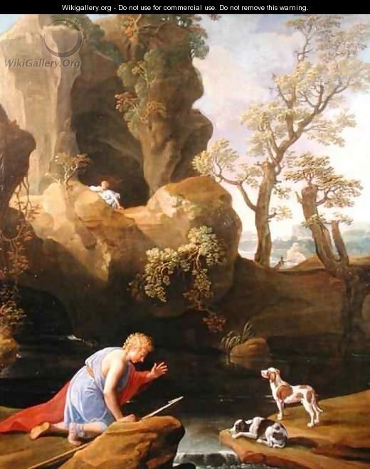 In this scenario, the composition is segmented, the bottom third representing the central scene in which Narcissus catches with joy first sight of himself. The reflection is hidden from us by an obtrusive rock jutting up from the picture frame, although further back in the pool another rock does enjoy its own reflection. Narcissus is surprised presumably during a hunt, as declared by his spear, now in relaxed state, and the hunting dog, who has gone to sleep. The other dog however looks up, his ears caught by sound. His gaze goes up towards Echo, who languishes in another segment of the composition.