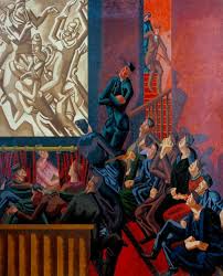 Their mass-gaze is itself multiply dispersed. No figure seems to look at the same thing; many seem vacant or inaccessible. Their eyes represented by slashes of shadow of varying thickness, none of them look at us. Any ‘represented’ floorboard-space is inaccessible to us and converges on the figures within the painting to give that sense of ‘compressed space’ noted.[4] Bomberg’s theatre-crowd fills space that holds it in. For the viewer, the act-of-looking is similarly constrained by the effective dominance of the irregular rail, which pushing onto the picture-plane, feels too proximate. The sensation is of both vertigo and claustrophobia. By 1920 then Bomberg’s theatre-crowd has changed from 1913’s revolutionary energy-blast to being symbolic of enclosed repressed-energies. There are deep similarities in Roberts’ work: The Cinema (1920) is a companion piece, with telling differences. However, this selection of British paintings, represents crowds (and ideas of multiplicity, diversity, partiality, and oppression, they themselves illustrate). They challenge Fry’s view that artworks are not necessarily representative of anything other than art itself; autonomous of political-life and engagement. Choosing images that engage politically and socially helps avoid needing to look too harmonious and unified. But this is complicated by the largesse implied by the idea of an art of multiplicity-and-diversity, especially at level of sociocultural politics. This painting-set demonstrates not only similar internal multiplicities and diversities within each painting but also interactional ones between them. In Bomberg’s case, for instance, the selection was driven by his particular interest in the crowd as a phenomenon of the Jewish diaspora. However, the motif in Ghetto Theatre is allied to Roberts’ At The Hippodrome (1921), since both illustrate segregated crowds. Yet Cinema’s reflective take on working-class cultural energies compels.
