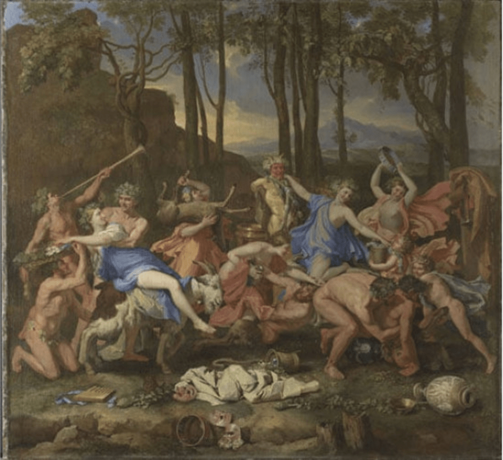 Taking on the speaker’s metaphor, I’d say that is what a party is – a revel that is contained by its own demonstrable boundaries in time and space – its CONTAINMENT. And what contains are the representations of the wild in the frameworks of art which Poussin demonstrates in ‘staging’ this revel together with the artifice of the theatre – its masks (comic and tragic), the proscenium on which it occurs, the use of wild nature as backdrop, wings and screens. And if stage & theatrical art also musical art of the orchestra, the art of harmonious couture, the beautiful display of the naked body in dance themes and attitudes.