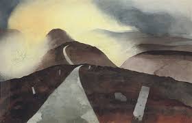 …a fascinated disenchantment with the places themselves? He seemed to dread them. They swell, stretch. curve, crease. Bruised clouds stack over them and break open. Floods and fields make their puddles of watercolour. … Rock outcrops are swollen with disease. Chasms dwarf. Bile yellow and a punishing green can hardly contain themselves. …. But what gives the pictures their emotional potency is their raking depth to the horizon, their roller-coaster perspective.