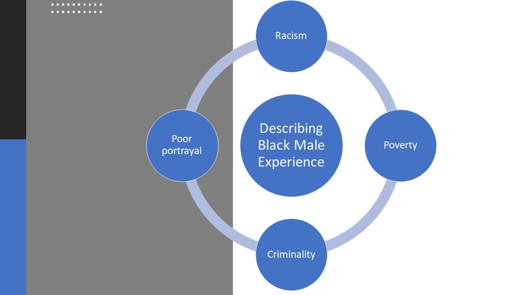 That Reminds Me is a novel I have already written a blog upon that tells truths about the experience of mental ill-health that few want to know, but they are also truths know to the care-experienced and people who use and survive mental health services. It literally cut me in its treatment of cutting. But as other writers in this say the stories that tie black male experience to the all of the disadvantages of a racist society may also not leave space for other stories – for more accurate truths for different and other black men. This can be seen as a negative basis of identity, which Nils Abbey in this collection identities as a negative and ‘poor portrayal of … Black Men in particular. It recognises’ racism as an aetiology of poor portrayal but seems too ensure a cyclical fulfilment of racism’s prophecies. Here is my graphic version of the cycle Abbey describes in bullet points: