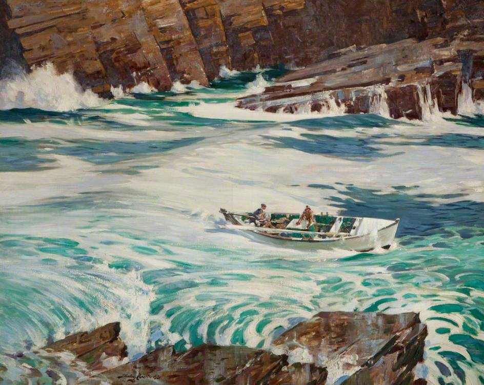 Hence then the fact that Linklater & Greig is a painting about the sensation of achieving something in the teeth of possible disaster. Its figures may themselves be important. A master local mariner, Robert Greig is being steered through a difficult pass in the seas by Eric Linklater – hand firmly on the tiller. The assurance speaks out from the 1933 portrait of Linklater, who loos down benevolently from a large portrait directly at the viewer.