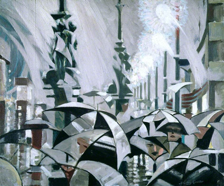 Similarly in my favourite Rain on Princes Street (1913), rain and light takes the form of a solid military bombardment, with something of the burst of Vorticism present. The fantastical animals on the lampposts appear to come alive and threaten the faces that appear in the separate frames of the umbrellas, which are variously missing. Two male faces to the right seem to ponder disaster, in one the eyes are merely dark holes.
