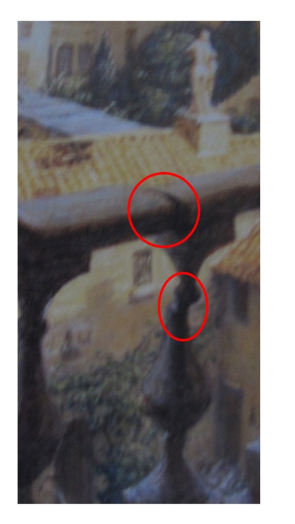 The effect on the viewer is to make us the feel the fall to which this recessed depth invites us, and perhaps the place where it would culminate. In this detail we see, what it took me a long time to see, almost hidden in plain sight as it is, cracks in the balustrade railing, structure, and ornament, that invite an empathetic vertigo and hard-to-name fear. This is not just play, it is danger. In my view, it shows us the constant changes of tone in the novel itself – from life to death, dark to light, height to depth and play to something uncontrollable about death which we might need capture within the art presented.