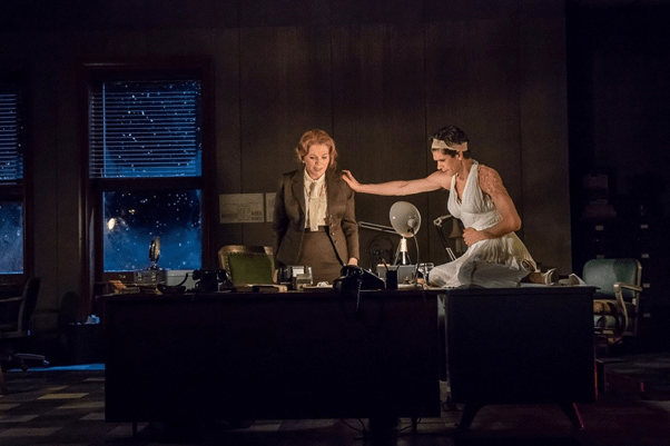 And therein lies the crux of this paradox of ‘acting’. When one performs a role, we have no reason to see ourselves as ‘fake’. Of a role there is only the possibility of performance, of being acted or not by someone. The choice not to act that role is not always there. Most certainly for Wishaw who sometimes plays under the texts instruction ‘Norma Jeane’, ‘Norma Jeane as Norma Jeane’ and ‘Truman Capote as Norma Jeane’. Under this, Wishaw and his director also invented another character – a man who dictates a story he is writing to be typed by a stenographer, who, in the form of Renée Fleming, also acts as a chorus and/or additional operatic-actor when that is required. Even down to the fact that Capote’s name ‘Truman’ is as indicative of the theme of gender as performance as any other sign in this play, we cannot escape the fact that Carson allows queer theory to play over her feminism.