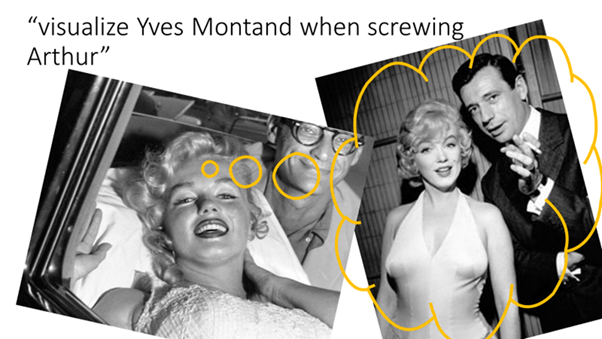 It is possible that the scene we are currently dealing with has a consistent thesis lying behind it from Lacanian discourse theory (even down to a characterisation of the l’objet petit a as the ‘unattainable object of desire’). In such a scholarly reading, the phrase, ‘Desire is about vanishing’ would seem to a reader aware of Lacan, as particularly fitting. But to seek such readings isn’t what I believe the scene does. Instead it dramatizes the effect of a person subjected to Lacanian discourse attempting to make sense of it, lifting significance where they can. This is most clear when Norma Jeane interprets ‘Cheeseman’ as saying to her that she ‘visualize Yves Montand when screwing Arthur [Miller]’.