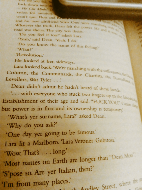 This page (again the reference is lost) is important because Dean is shown to know no significant political history – only the Communards’ was also a band (yet to be) for instance – but Lara thought she was talking to Dean about episodes of left-wing assertion, however ill-enduring. The line, “Dean didn’t admit he hadn’t heard of these bands”, is just pure fun. But Lara’s statement that ‘power is in flux and its ownership is temporary’, is tremendously important to this novel.[7]