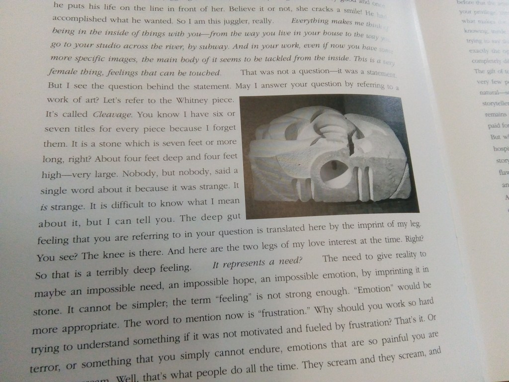However, to establish how this happens across the many varied types of inside and outside comparisons made by the artists she features in this book. They are at their most approachable for me in two of my most favourite artists she choses: Cy Twombly, whom I’ve mentioned above, but also her first chosen subject, Louise Bourgeois. Bourgeois did allow her interviews to be published and Igliori’s seems at her nearest to this artist of fragmented body parts and things felt from the inside. We see this proximity in the photograph below of a section of that interview with an inset photograph of the artwork by Bourgeois they are discussing.