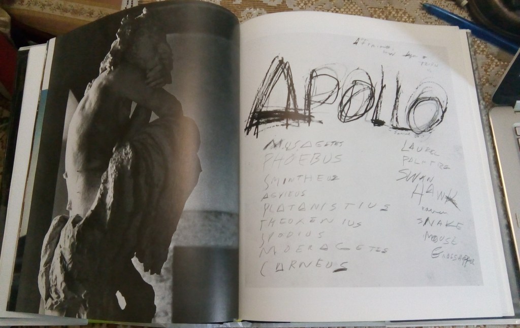 And perhaps I can also leave without commentary another dualistic view from Twombly where what looks like a satyr, perhaps Marsyas, confronts, for the purposes of Igliori’s momentous book, the conceptualisation Apollo on the facing page.