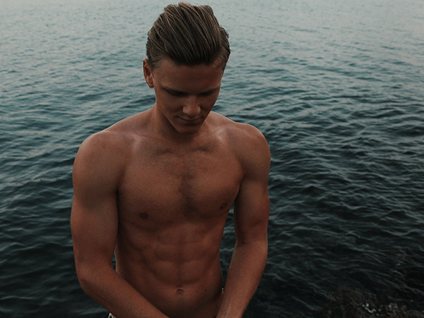 A question remains for me – at least to satisfy myself for this piece of mine. Is the real life of Wallace after the novel to contain Miller or not? In many ways Miller is like one of those thin fish he so loves to consume, a water baby, with a more fluid sexuality than he likes to think, like that in the picture below of the gay Jock ideal. As Wallace guesses another way in which he and Miller differ from the norms of academic life on this campus is their working class origins. They like easy cheap food for instance.[15]