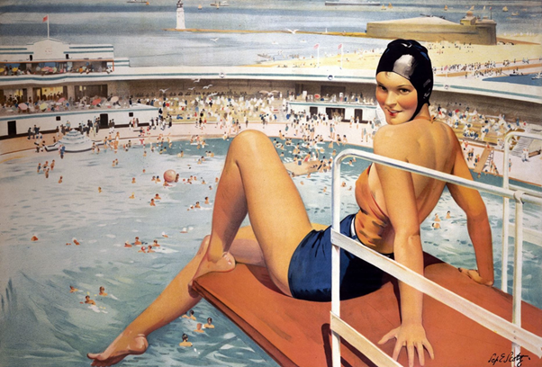 A prominent feature of the lidos were the tiered platform towers, structures only enabled by the existence of reinforced concrete as a material that acted as diving boards. In fact as in all the examples these were also as properly known as platforms affording a view from and of them and this is exploited in the painting, where the phenomenon of pleasurable viewing is the clear subject. The viewer of such railway holiday posters is caught in the high desire to view the mass s(he) inhabits, like dots below them in a vista that offers itself and is symbolised in the half-returned gaze of an anatomically impossible bathing belle, whose right toe seems visually to touch the water she is, in purely visual perspective, much higher above. She is reduced to body parts and these parts find no whole image, being rather laid out to the view and filling the picture space. Meanwhile the masses below have their own platforms for viewing. It is an intriguing image. The Lido is a domain of the eye in the design shown by Septimus Scott.
