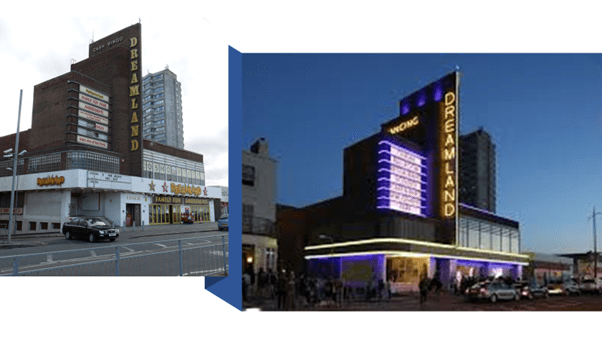Now the Funhouse has no external stairs although the experience of the interior involves climbing up and down to moving walkways, slides and other vertically challenging pleasures. This idea is expressed in the layering of the architecture into faux tiers against the flat background of the concrete, almost like tiered viewing platforms, and towers with over-sized platforms dominating their top. Flat backgrounds become a feature of themselves, almost as if a non-supporting wall becomes a static flag or page on which to write or draw (in mock fresco) the pleasures they contain and advertise to those still outside the building. A pleasurable aspect of such architecture is the use of complex or unusual large fonts used to name the buildings on their outside. The Funhouse is a fine example but Dreamland cinema, leisure and restaurant complexes have a similar look.[3]