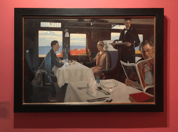 Such differences in the representation of subjective viewpoints is examined in Art Deco painting and some examples make rather splendid use of the concept of the desirous, concupiscent or envious gaze. These are two paintings I found to excel over others in this regard. It also points out that the exhibition is brilliant too about transportation modes and their architecture, although I’ve chosen not t consider them in this blog. The first is Leonard Taylor Campbell’s Restaurant Car (c.1935) now stored in the National Railway Museum. Here it is: