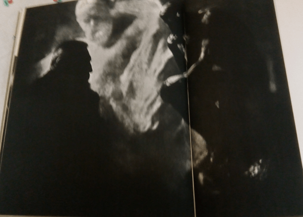 The most telling expression of this last point are the photographs given an entire fold of the book for themselves, especially, image 82, Edward Steichen’s photograph of the French sculptor, Auguste Rodin. Gruber’s note on the photograph shows how the photograph was staged and lit to create the sense that the man’s work reflected the greatness of his creative drive. Steichen chooses a trinity of figures in which the thinking poses and postures of the three reflect on each other through patterns of light and dark. Rodin’s Monument to Victor Hugo | Rodin Museum (musee-rodin.fr) at the rear bears the only visible face shown frontally in the trinity of figures but the ‘body’ of Hugo’s statue represented is unfocused, appearing almost numinous, spiritual or ghostly and, as if it were emerging from out of its darker background. It seems moreover to represent the full effect of the only light source in the piece. This light, apparently also reflected from the folds in the gestures of the body of The Thinker and at the statue’s rear, shows the form of that latter work alone through contrasting tones in the chiaroscuro. In order to represent Rodin himself, Steichen spoke of his intention to use a ‘silhouette’ to ‘give emphasis to that massive, expressive head’.