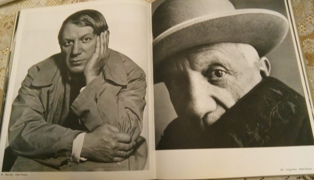 Of course, demonstrating the beauty and wonder of this book could continue throughout its many wonderful images and contrasts between contiguous images but I would like to end by looking briefly at an example where the work of two photographers of one subject, at different points in the career or stages of their self-fashioning as in the Dali case above, is examined. Since we are talking now about visual artists, let’s conclude with two contrasted images of Pablo Picasso.