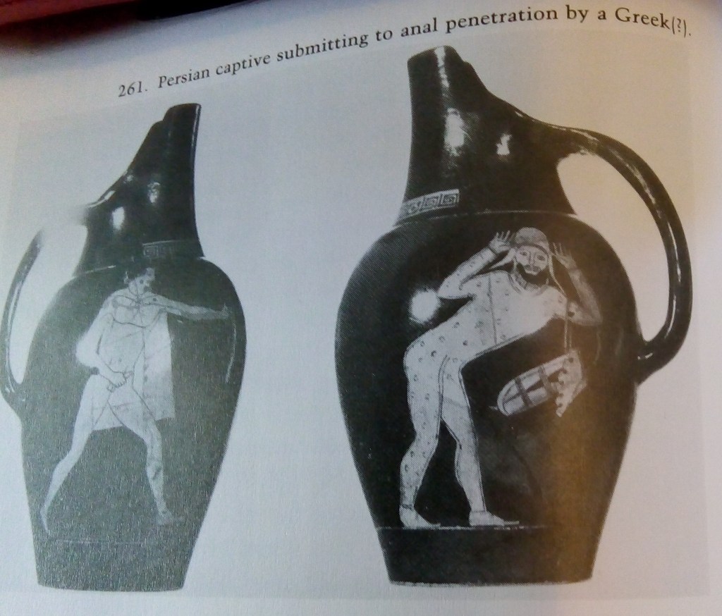 We are used to equating sex and especially male sexual penetration with images of superior power. Even in Ancient Attica, it was enough for Aristophanes to condemn Cleisthenes by referring to him as a ‘wide gaping ass hole’ (in Keul’s translation). Eva Keuls also adduces possible earlier evidence from a red-figure pitcher, which possibly shows the victorious Athenian manhood preparing itself to anally rape a Persian captive of war.[2]