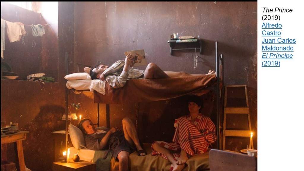 The detail above from the film shows that point (Jaime is in prison and has been adopted by El Potro as a current lover) where Jaime begins to realise the power of how he ‘looks’ to others as a means of gaining his own ends in terms of status and goods (especially a beautiful pibk jacket). But though the character learns to refine that look for the purposes of power and transactional wealth in the prison economy, the film does not I believe explain sexual love and its nuanced versions this way at all, otherwise why invoke Plato who felt that reality as most men see it is a confused mirror reflection in a dark cave.[1]