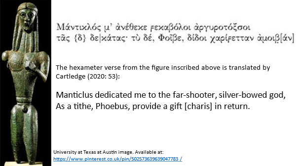 This ‘nominal trap’ carries, Cartledge argues, assumptions and value judgements. The term ‘Archaic’ casts some degree of preference to successor ‘Classical’ civilizations and to suggest imperfection and incompletion. Yet the flowering of Spartan culture was in Archaic not the ‘Classical’ period and Theban strength probably also emerged most strongly in this period as one of the leaders of the geographical area (or ethnos, since the geographical assumption was based on distinctions between peoples) we call Boeotia and may already have federated itself as lead, or co-lead, in that area.[4] Art from that period includes representations of Apollo marked with hexameter verse in readable Greek characters.[5]