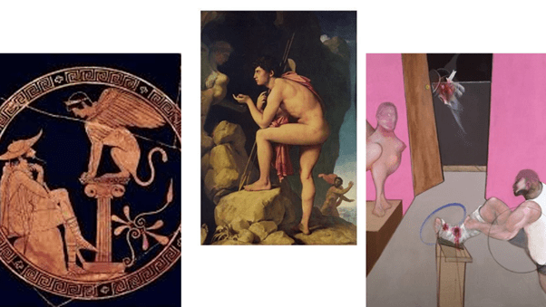 We can talk about each of these as a reception of the myth because they interpret it differently in line with issues known to them. but receptions play upon each other. Freud venerated the Ingres painting, The Bacon is explicitly labelled ‘after Ingres’). Bacon knew his Fred though Ingres could not. But there is other commonality here other than overlap which has to do with more than ‘reception’. each emphasises a mystery or darkness about the sphinx, although Bacon delegates that darkness behind a door opening onto a dark interior space in which a strange figure lurks, sometimes said to be a Fury. Though, Bacon’s sphinx looks like a reproduction cast, its face bears the secret of other faces that merge into or come out of each other, whilst the Swellfoot (what Oedipus means and the name given to Oedipus in Shelley’s political ‘Swellfoot the Tyrant’) wounded foot seems to belong to George Dyer, Bacon’s dead working class lover. We are in each questioning the very relationships that are discoursed upon. And I think this is true of the 5th century example as well. In each the Oedipus figure is overconfident of his own knowledge and will therefore be brought low. Perhaps the 5th century example is itself more mysterious than the others since we see Oedipus as a traveller and at rest. And though he is situated beneath the sphinx, he still seems to command the space. Versions of these ideas appear in all these images. And most receptions too have such commonalty in a myth or play to call upon.