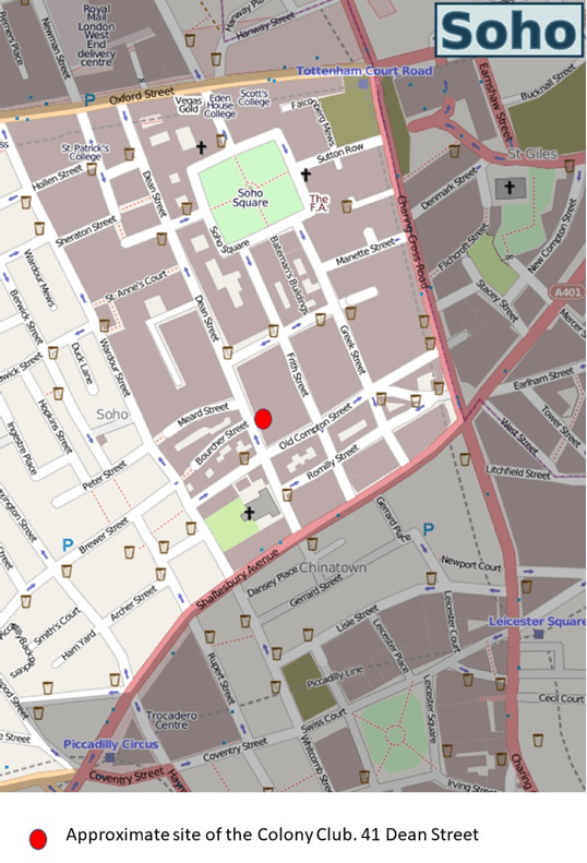 However the special and specific nature of The Colony Club was fostered perhaps by its place on the edge of other conventions and norms than the law, although those definitely included the law. Coffield again, in the same interview refers to post second World War Soho as a ‘square mile of vice’, considered at the time as the most illegal areas of Europe, associated with the activities of criminal gangs, prostitutes and ‘queers’.[7] The latter term was a contemporary one and, though for some it was interchangeable with the medicalised category, ‘homosexual’, does not describe very strictly the queer nature nor sexuality of Colony Club members. These were rather people who define themselves against any range of extant social norms, even those that defended the realm by licencing laws, that for some included sex-and-gender-norms. Even class norms were blurred and the Colony included those who equally rebelled against social norms from a position of class privilege, including Princess Margaret, the Queen’s sister, and bevies of aristocrats who hated the imposition of bourgeois sumptuary laws, or indeed other non-legal socialised mores. Such norm breaking characterised the reputation of Soho.