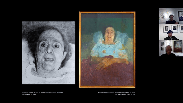 He sits for his Art Club talk below in front of his painting, itself based on a photograph (for which both states are shown in the film), named ‘Muriel with Daughter on Her Mind’. Lying on her putative death-bed, Bacon’s own death is what Muriel pre-figures, a death entirely subservient to an art that may not matter other than as a relation between human beings.