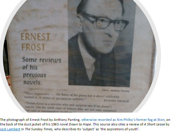 Jack Lambert in a contemporary review of the novel in The Sunday Times confidently describes the ‘subject’ of A Short Lease as ‘the aspirations of youth’. And youth was also very much on Frost’s mind in the novel that, after a ten-year period of silence as a novelist that followed The Visitants in 1955, Down to Hope. That later novel starts by ‘youthful aspiration’ being put firmly in its place by those with age and authority, whether they be fathers or headmasters in academic gowns, who attempt to shape youthful subjectivities and choices, even from that novel’s opening line,: “When I was your age …..”.[2] It even uses this theme in its epigram from George Barker’s  poem, Allegory of the Adolescent and the Adult.[3]