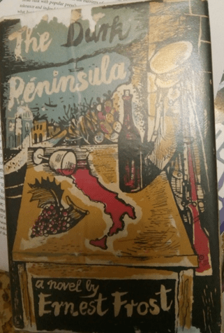 John Minton pictured Italy on the 1949 dust jacket of the novel, with what prompts from Frost we will never know, as a wine-stain on a Mediterranean seaside table. The stain proceeds from a glass upset on it and its red is reflected faintly in the bunch of grapes cast aside, presumably by the absent soldier, and in his erect gun, which rests against his discarded outer clothing hanging against the nearby wall. The disruptive power of passion spent seems to me the referent here that is perhaps symbolised in all of the cover’s symbols coloured in that same red: the gun, the bottle of red wine, the wine stain itself, and the discarded grapes lying across the cork screw that had been used to open the re-corked bottle. In the Mediterranean context – the bay dominating the symbols of dryness and control (that church cupola for instance) on land – is already a very Dionysian symbol of passion disrupting the order of things. It is embraced by a circumambient black darkness, that is recalled too in the mix of the wine bottle, in which a man has laid down his arms and rested himself for the night in ‘exhausted sleeping’.