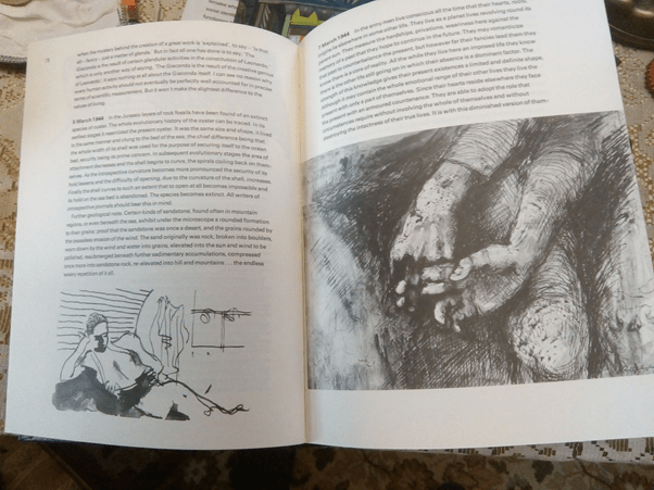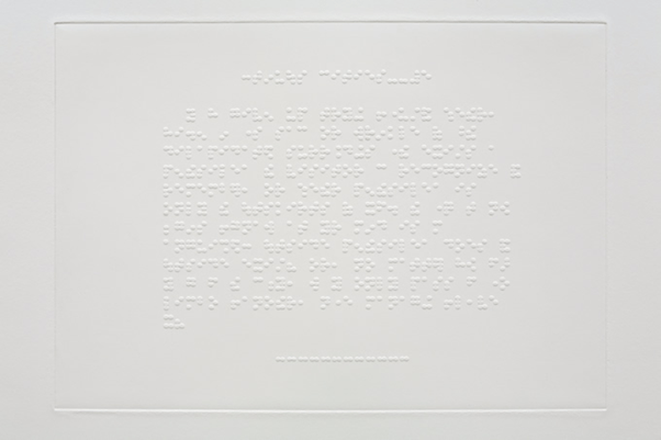 It consists of five etchings embossed with braille text from a novel by Italo Calvino, and hence not easily ‘visible’ except through touch but encased behind glass in order to ironise this very aspect of the museum’s role in preservation of objects, particularly from supposed damage caused by touching.