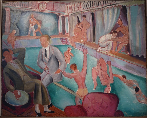 The most iconic of these earlier paintings, all kept in the private collections of people who, by and large, were both rich (or connected to the rich) and ‘privately’ queer (small cliques can be described as ‘private’) like Eddy Sackville-West and Mattei Radev, is Exercises of 1925. As the Head curator of Pallant House, Simon Martin, has suggested, in 2018, that an ‘objective selection of works, not leaving out those that may be deemed controversial or expressive of an artist’s sexuality’ was not commonly the normative practice in the ‘curatorial process’ before the advent of explicit queer curation.[17] And though I agree that there is no doubt that Exercises ‘may be recognized as ‘queer’ by some visitors but not necessarily by many others’,[18] what speaks from this painting is mainly the opulence that associates exhibition with private ownership and a flexibility of embodied male sexuality to variations of public/private visibility and bodily touching. This is a painting that plays with what the expensively clothed and accommodated males in the relaxed comfort of a luxurious home do not see, or at least do not publicly acknowledge.