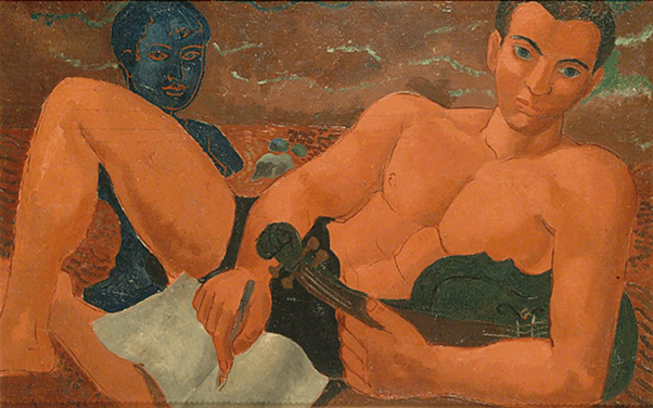 When Constant appeared as ‘The Bather’ he is awarded the same huge purposive hands as the earlier type of the male bather already discussed. Constant’s hands though clutch instruments of the composer’s artistic creation, a pen writing a score and a violin, although playful phallic suggestiveness remains, I think. Then there is a shadowy male observer of Constant in the shape of a blue-tinged bust overlooking the nude’s generous torso. Here work is still playful and gets away with it, in ways fisherfolk don’t quite, in the ‘primitive’ paintings. Artists after all aren’t working in life and death situations with skeletal half-built boats.