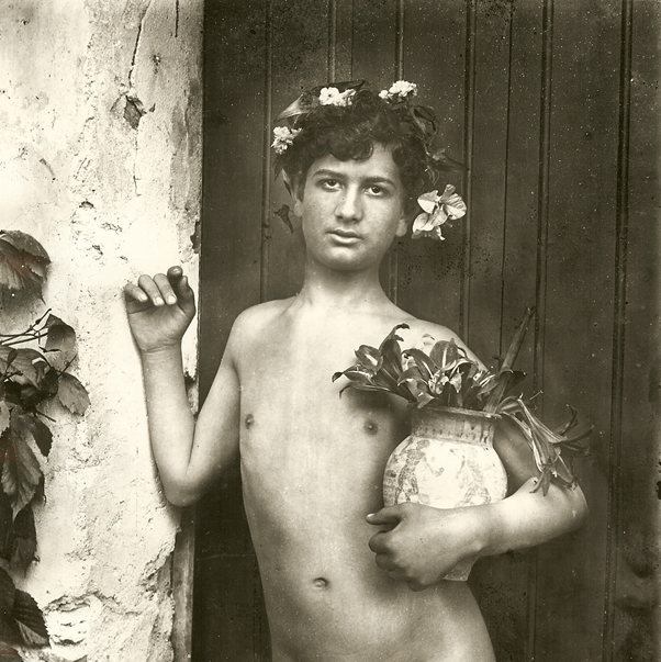 Wilhelm von Gloeden (1856-1931). [cropped version – see link for actual image] A naked boy wearing a flower crown and carrying an amphora. Catalogue number: 1039. Available at: https://commons.wikimedia.org/wiki/File:Gloeden,_Wilhelm_von_(1856-1931)_-_n._1039_-_da_-_Amore_e_arte,_p._92.jpg