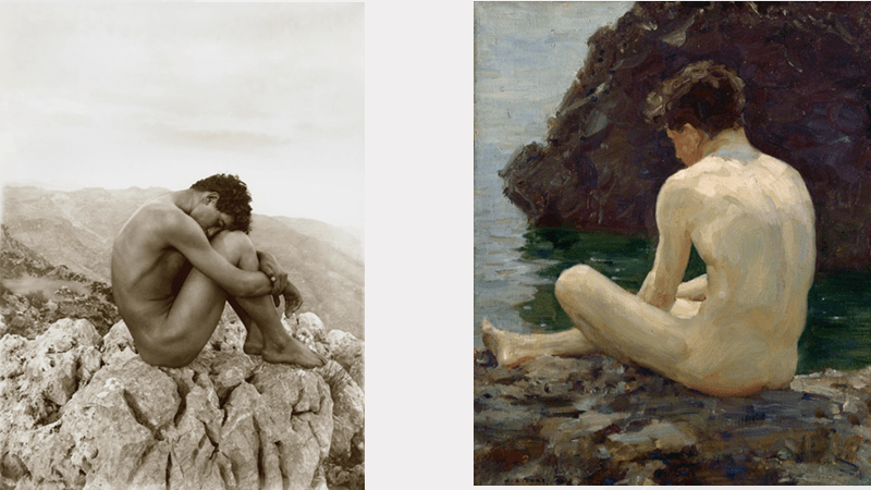 In my view Stephenson tries too hard here to suggest that the painting is a coded secret for a specialised ‘homosexual’ audience. This feels to me a means of grossly oversimplifying the nature of sexual desire such that it fits the more the more perfectly the model of the free economy of sexual desire led by powerful and less powerful forms of demand. It is true that these images have appealed to ‘homosexual audiences’ but the nature of that appeal may not be as simply understood as any simply heteronormative hegemony in the social understanding of sexuality would imply. It would seem to me that von Gloeden does considerably simplify Flaudrin’s icon of the reflective seaside ephebe, but that oversimplification serves definite purposes in asserting the power of a dominant gaze – that of the Western white male whose agency as a sexual master and owner of the exotic other is facilitated socially.