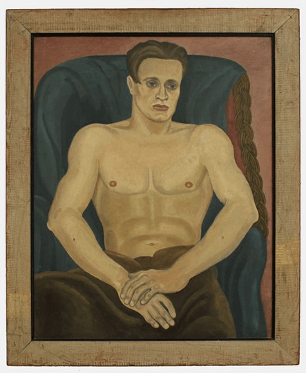 Even in Banting’s portrait, this body invites our gaze in worship and lust and is, without any need to make the organ visible, intensely phallic – the geometry of Tomlin’s musculature and his arms drives us down, as to the apex of an inverted triangle, to his folds of his clothing around his groin, which almost sits on the edge of the bottom of the picture frame. That this embodies Banting’s desire as much as anything in Tomlin seems obvious to me, not least because the Tomlin painted also defects from any appeal to the eyes of his viewers with an off-centre gaze and the head, and therefore eyes slightly tilted to the viewer’s left. Narcissism alone will not suffice to explain this just as images are never able, and may be entirely incognisant, to articulate all the contradictory emotions that explain their power, not least the (temporary at the very least for men in a patriarchal society) the vulnerabilities exposure brings.