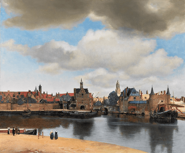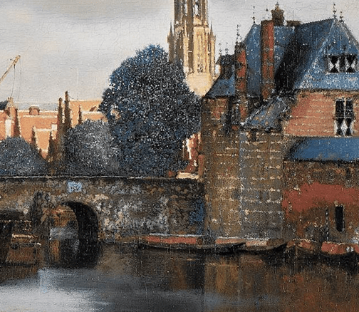But as well as the obvious link between this and Hockney’s view of Chinese scroll work and the Bayeux Tapestry is that this is, in the book, also treated in terms of visual art as the comparison to Cubism shows. That linking theme is an ongoing elaboration of Hockney’s enduring insistence (to which the history of art continues to turn a blank eye) that, “we see with memory”.[13] It is a complicated interaction however – that of memory and present perception. Gayford (and it is unclear here whether the commentary is his own or the reported speech of Hockney himself [and perhaps it doesn’t matter]) discusses this in retelling how Proust’s fictional artist of the novel, Bergotte, revisits Vermeer’s wonderful View of Delft (see below) to see again in it the little patch of yellow wall (‘petit pan de mur jaune’).