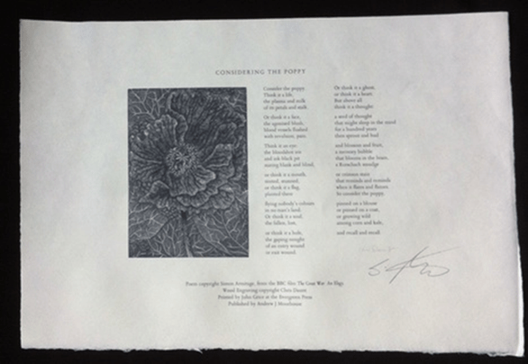 I will finish by looking at the title poem, which you may be able to read by enlatging this copy of the broadside version – the pic is available from: http://www.finepresspoetry.com/considering-the-poppy—simon-armitage–chris-daunt.html .