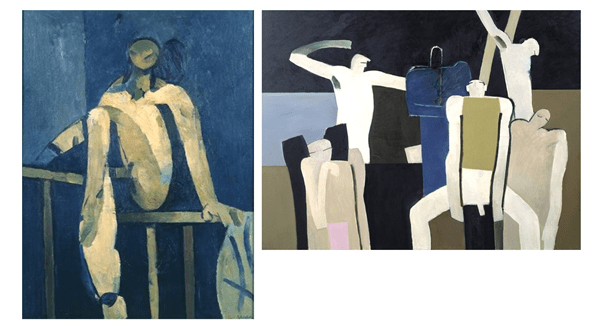 John Berger once tried to see the bare feet that characterise these young men as a hint of political realism, a subtle politics, but they equally act as an emblem of the naked essence of the men. They are often focused upon at the cost of massive distortions of the figure and its place in the landscape, or patterned as the emblem of masculine togetherness in dance. The examples are complex and not clear icons of attraction, though they approach that. Examples are Figure in a Grey Landscape 1945, Greek Fisherman 1946, Galatas 1947, Pastoral for PW 1948, The Dancer, & Two Greek Dancers 1951, Shepherds near Knossos 1947, Boy on Wall 1958, Workman III 1961, Voskos II 1984, Two Figures And Setting Sun 1952-67.