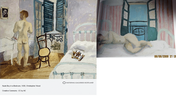 In my view the Nude Boy in a Bedroom (1930) is best examined using queer theory. It is, of course, probably necessary to report that it is usually thought that the nude boy is a portrait of Francis Rose (about 21 at the time), friend of Gertrude Stein and Toklas (the latter’s Cookbook illustrator) and, at this time, visiting Brittany alongside Wood and gossip says ‘a noted homosexual’[4]. It is set in what we believe to be Wood’s hotel room. But that aside, it is not a ‘sexualised’ scene. The ginger-headed boy at his morning ablutions (we can see by the strength of the penetrating sun it is morning) turns from his sink and towel (the latter still in his hand) to gaze at a picture of a Breton maiden. On the bed lie three Tarot cards – the same ones appear in Calvary at Douarnez (1930) and predict, Norris (2016:153) argues, ‘financial and romantic insecurity, as well as alluding to danger.’ Nothing in the picture makes us conscious that the ‘boy’ is aware of being seen. This picture bears nothing of the portrait of Lambert above. It cannot be described as homoerotic (although it is, I would say, homosomatic).