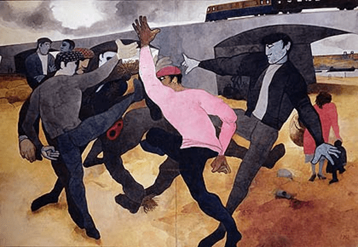 So perhaps we need to look briefly at Burra via Martin (2011)[3]. Although it is true that there is overt queering of the white and black body in Burra, it is not always straightforward in its picture of desire – nor do I think it makes a virtue of labelling its figures or overall meaning ‘homosexual’. His great picture The Straw Man (1963) surely shows this, in ways it would be difficult to explain in few words, so I’ll use that as an excuse to leave it there.