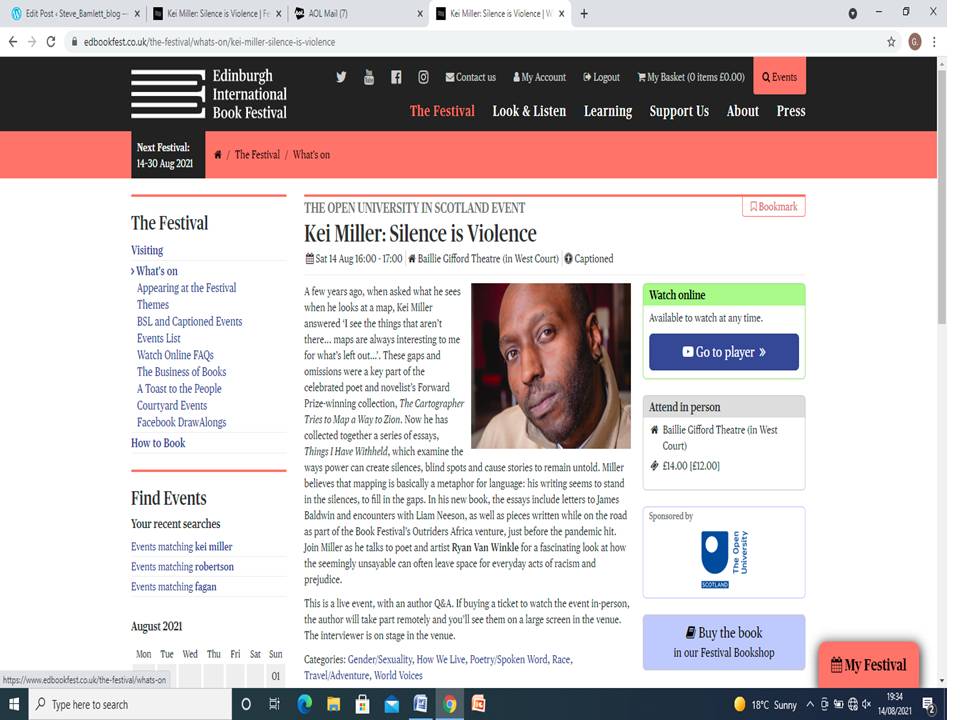 Link is : https://www.edbookfest.co.uk/the-festival/whats-on/kei-miller-silence-is-violence