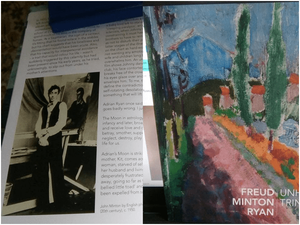 When we consider the ‘unholy trinity’ Minchin has unearthed, both Ryan and Freud maintained later silence on the matter but Freud more than Ryan. One wonderful part of the exhibition I saw at the Victoria Gallery Bath has a video replaying part of an interview with the painter David Tindle by Minchin filmed by Isaac Biglioli in February 2020. In it Tindle confirms his knowledge of the ‘trinity’ and including the role played by Johnny Minton, ever on the lookout for queer friends. Tindle confirms he is told Minton that he was not queer and that Lucian had said that he ‘would be the first to know it if true’. Freud was to denigrate anyone adding to this evidence and Minchin shows how, without the facilitation of Minton, Ryan too felt unable to assert a relationship to Freud and let it ‘diffuse’.[13] What is left of the ‘unholy trinity’ given that the answer to ‘when shall [these] three meet again’ was, after Minton’s suicide, The Raven’s ‘Nevermore’.
