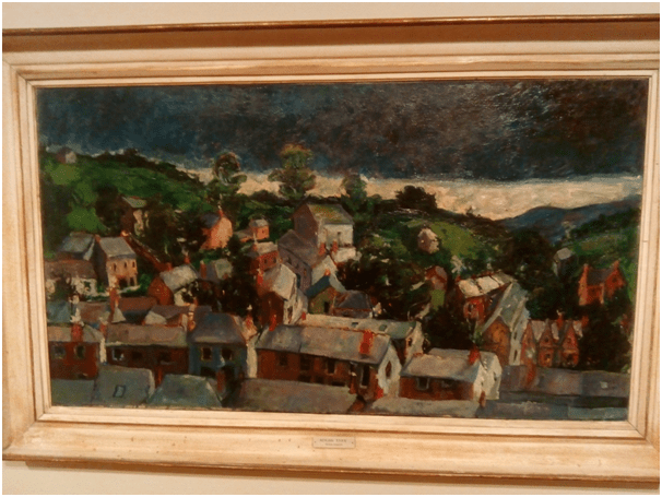 Ryan’s home (Myrtle Cottage) is, according to the title this picture has in this exhibition (Dawn over Newlyn, View from Myrtle Cottage) the source of the viewpoint on Newlyn but the perspective feels to me rather impossibly mixed. There are confusions over where, between hills and the valley on the valley’s right, backed by a mountain, the distant vanishing points might lie. Moreover, these seem to be contradicted by an almost dynamic aerial downward perspective on roofs and dark passages (as if from a roving bird’s eye, hidden between rows of these. These homes appear first, at the base of the picture frame in linear series running alongside hidden streets and then in muddle as the ground rises unevenly behind these streets.