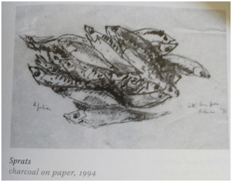 The tangle of fishes – bought for Adrian from Sainsbury’s for little more than a pound –  against the translucent off-white paper is dramatic, … as though they were still moving . One stands out from the crowd, the nearest one to the viewer, the remotest one to the rest and the least abstracted and tangled up. “He was in the group and yet he wasn’t” – the astuteness of Guy Roddon comes again to mind,[11]