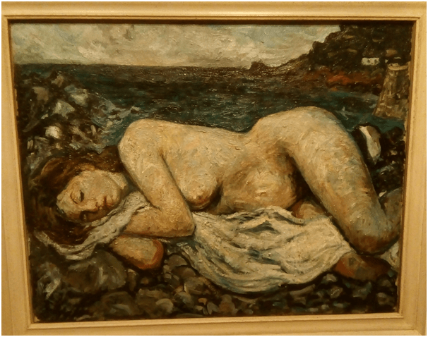 I think there is a commonality between Ryan and Freud, though the latter’s ambiguity about his early queer encounters had a lot to do with the fact that it was okay as a Companion Of Honour holding the Order of Merit to have a reputation for fathering 35 children with different women but not to have confirmed that he had sex with men.[14] For Ryan the relative silence had more to do with a sense of the nuance locked in private lives. For me, it speaks in those closed-in townscapes described by Minchin and his preference for the pinched almost close as in his picture of Mousehole Harbour Quay. His one female nude (in this exhibition and a beautiful painting) feels to me to act as a front to his passion for the sea, which appears about to take her in her sleep. Minchin senses that Ryan was ‘terrified of female power’ because of his inability to account for his masculine ‘side’ in any simple and satisfied way – it is always being questioned by women whom ‘he either idealised or disliked’.[15] And this nude is either being consumed from behind or has taken over the world of men at sea in its entirety and is threatening to overshadow it.