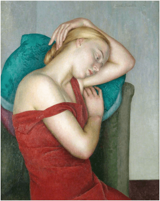 Even if that assumption can be made – and surely it cannot always be made, since otherwise a queer perspective would be impossible which it is not in art or anywhere else – then it reduces the painting to an observational desert. In Girl in Blue the social status of the young working-class girl model, Cissie Barnes, is signified by the actual function of aspects of her clothing. If that were not the case this painting could be seen as exactly the same as paintings of the decidedly middle-class and educated model otherwise used by Proctor, we know as Eileen Mayo, also a painter. In paintings of Mayo, eradicating a ‘male gaze’ seems barely attempted; indeed it such gaze may be invited by the trope of the slipped shoulder band (which got John Sargent into trouble in painting Madame X, even though he did not go as far as dressing Madame X in scarlet).