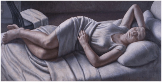 … Morning (1926) shows a woman, asleep and perhaps on the verge of waking, with her right arm thrown back over her head. George Eliot’s description of the Vatican Ariadne, in Middlemarch, might also serve to describe Procter’s subject: “She lies in the marble voluptuousness of her beauty, the drapery folding around her with a petal-like ease and tenderness.” Well, not marble: paint. But even so, the white sheets and nightgown that Procter has arranged around her model strongly recall the pale chilliness of antique sculpture. View the image in a certain way and you could almost feel that the stony solidity of those sheets was consuming the young woman, like some heroine from Ovid’s Metamorphoses being steadily transformed into a rocky outcrop. But despite the cool density of that cotton drapery, the figure is a sensuous being, fleshy and pink, and her left fingers – departing from the original pose – hover suggestively around her crotch, … . The sitter for Procter’s painting was Cissie Barnes, the 16-year-old daughter of a Newlyn fisherman, and there’s ordinariness here: she’s very definitely not a mythical heroine, even if we’re being reminded of her Renaissance and classical forebears.[9]
