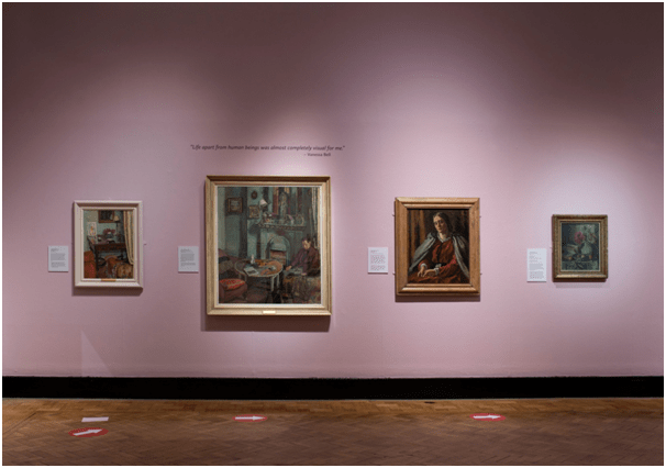 That this exhibition defies crude reduction of women artists to their biology alone, or even a voice, is the real achievement. Rather the exhibition champions coded mood. That is clear from the opening where a selection of all four exhibited painters hang on walls painted white especially for the exhibition, although white is also the (suitable) wall colour for Gwen John. From then on, each artist is represented by the colour of the walls on which the pictures hang. I do not sense anything reductive here – the choice of ‘pink’, the most easily reducible to a code with a single meaning is allocated to the most complexly interior of these women, Vanessa Bell. Everything works well in this silently brilliant curation, from the placing of apt citation for instance in relation to the relative design of the placing of pictures to the contrasts of complex colour internal to a picture (never have I seen so strongly the effect on Vanessa Bell of the example of Matisse – in her 1915 painting of her husband’s mistress, Mrs St. John Hutchinson, for instance, than I have in this great exhibition). I refer to that painting in an earlier blog (see link). See for instance the placing – so fortuitous – of the painting of a Charleston interior in which Duncan Grant so carelessly but lovingly sits, in the photograph – made by the exhibition’s publicists themselves for Twitter – below.