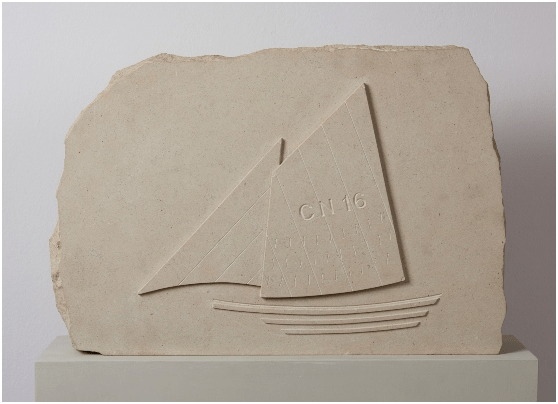 You aren’t allowed to take photos in this exhibition because an easily available small catalogue exists and it is both cheap and beautiful (my friends, if I have any, are not meant to apply this label to me). In a way this is a great pity and only some of the photographs in the catalogue give an adequate idea of this since most of the artworks need seeing in their 3 dimensional presentations. This detracts from how very moving in situ some of these pieces are. The work, of course, always in some way refers back to a master concept first set out in Hamilton Finlay’s art garden at Little Sparta. It was originally of course known as Stonypath and is situated around a farmhouse bought by Hamilton in the Pentland Hills. And, since I have never visited this Mecca of modernism, although the project reminds one most of the work of Eric Gill, I had to rely on the literature available at the exhibition to allow me to see the significance of the Marine theme to the garden, or at least to the section known as ‘the Lochan Eck Garden’, which refers to its function as ‘the playful site of sailing – of hand-made model boats …’.[2]