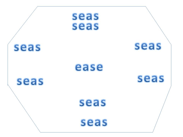 This is because the effect of the assonance between ‘seas’ and ‘ease’ seemed to be evoked by the necessity to read out (internally) those words, allowing their associations to grow in the viewer’s thoughts and feelings. The ‘cross’ in the artwork remains only as a disposition of the words into cross shape. Yet to me the idea of a cross, fails entirely in reproduction, which needs the placement on the wall to take this conceptual form. Here is my inaccurate version of the shape.